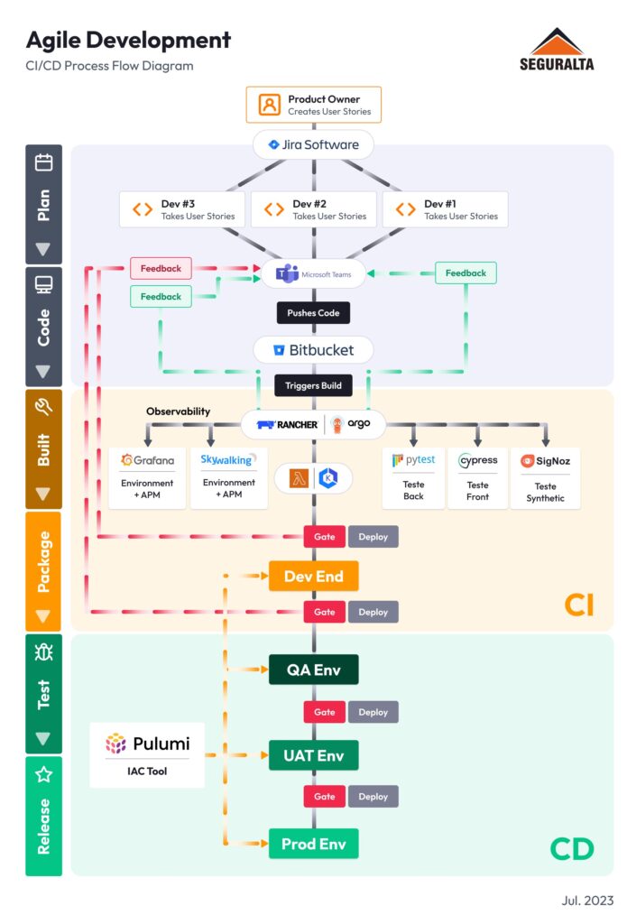To ensure the workflow’s functioning and solution integrity, Seguralta adopts Infrastructure as Code (IAC) throughout the entire platform, implementing the DevOps flow below